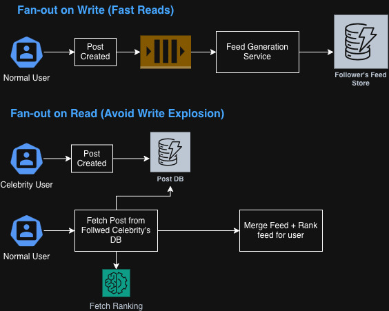 - Pushes post into feeds of User B’s followers (fan-out on write)